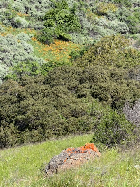 The orange patches visible on some rocks in these areas aren’t rust—they’re lichens growing on exposed rock surfaces, a common sight on serpentine outcrops in the South Bay hills.