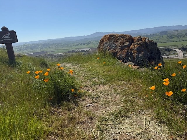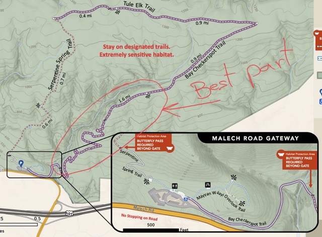 Bryan and I hiked the entire trail (about 5.4 miles) counter clockwise (steepest climb first, about 1000 feet).  But the best part, which was absolutely stunning, was the Bay Checkerspot trail. The 1.5 miles south of the parking lot is the best part.